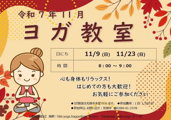 投稿日: 2025年10月5日2025年11月9日 投稿者: brainnet令和7年11月開催 ヨガ教室 ヨガ教室 開催日のお知らせ 初めての方も大歓迎です。お気軽にご参加ください。 参加申し込み・お問い合わせは光得寺(電話 0284-41-1978)までお願いいたします。 寺ヨガ 日々ヨガ